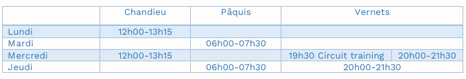 Retrouvez en détails les horaires des entraînements pour les compétiteurs « Groupe Master Compétition »: